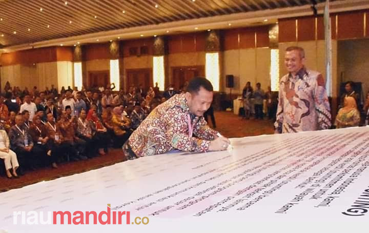 RIAUMANDIRI.CO, JAKARTA - Bupati Kampar Catur Sugeng Susanto menandatangani pernyataan bersama komitmen pelaksanaan percepatan pencegahan anak kerdil (stunting) pada Rapat Koordinasi Teknis (Rakornis) di Hotel Grand Sahid Jaya Jakarta, Rabu (3/7/2019).
