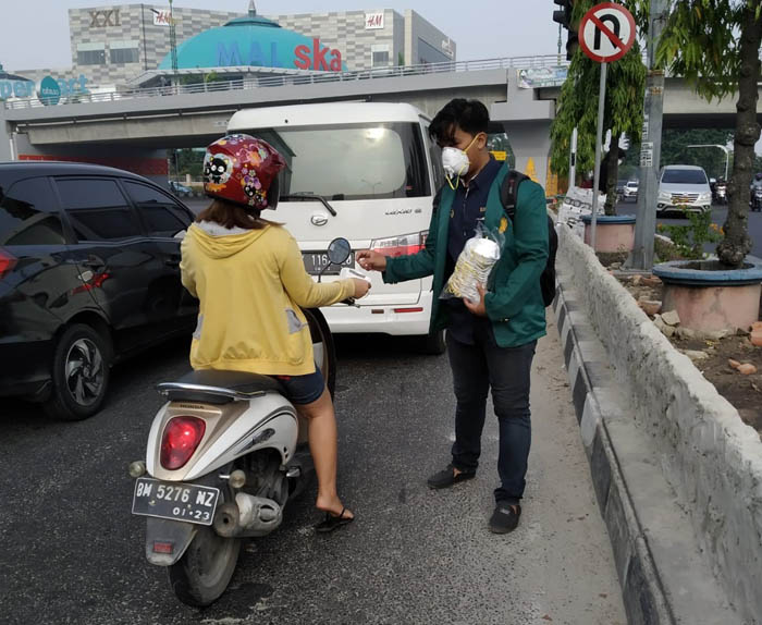 Kegiatan pembagian masker kepada masyarakat, terutama pengendara kendaraan ini, dilakukan di sejumlah titik di Kota Pekanbaru, di antaranya, di perempatan Ska Pekanbaru dan kawasan lampu merah menuju Bandara Sultan Syarif Kasim (SSK) II, Kamis (8/8/2019) pagi.