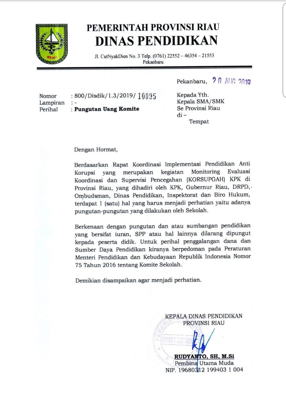 “Jadi ini sesuai dengan hasil monitoring evaluasi koordinasi dan supervisi pencegahan (Korsubgah) KPK di Provinsi Riau. Rapat ini dihadiri Gubernur Riau. Dengan telah dikeluarkannya surat ini maka sekolah dilarang memungut iuran, sesuai dengan isi surat ini,” kata Kadisdik Riau, Rudiyanto, Kamis (22/8/2019).