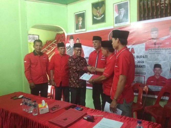 RIAUMANDIRI.CO, MERANTI - Masrul Kasmi mendaftar sebagai bakal calon bupati (bacabup) Kabupaten Kepulauan Meranti ke Kantor DPC PDIP Kabupaten Kepulauan Meranti Jalan Alah Air Selatpanjang, Selasa (10/9/2019).