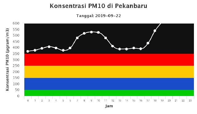Bahkan berdasarkan informasi di situs resmi BMKG, bmkg.go.id, pada pukul 21.44 WIB konsentrasi partikulat PM10 di Kota Pekanbaru sudah melewati batas tertinggi pada level berbahaya dengan angka 748,628 ugram/m3.