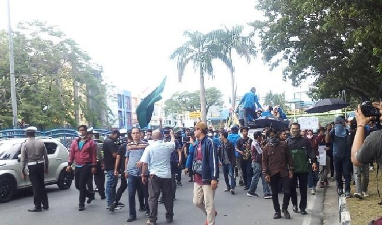 RIAUMANDIRI.CO, PEKANBARU – Massa dari Aliansi Masyarakat Sipil Riau terus berdatangan ke DPRD Provinsi Riau Jalan Sudirman Pekanbaru untuk menolak RUU KUHP dan UU KPK, Kamis (26/9/2019) siang.