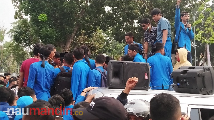 Wakil Ketua DPRD Provinsi Riau, Zukri sempat menemui mahasiswa, namun massa menolak berdialog di luar gedung.