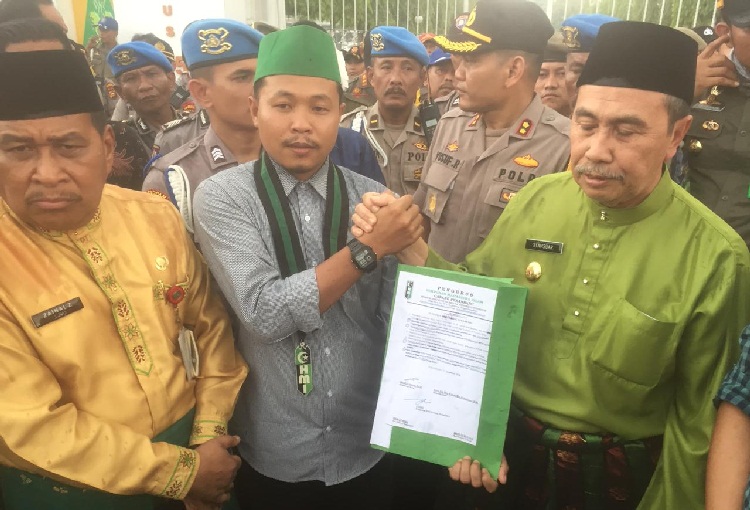 RIAUMANDIRI.CO, PEKANBARU - Gubernur Riau (Gubri) Syamsuar akhirnya menemui massa dari Himpunan Mahasiswa Islam (HMI) yang melakukan aksi damai terkait kebakaran hutan dan lahan di depan gerbang Gubernuran, Jumat (27/9/2019).
