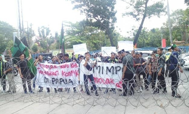 Massa terlihat marah karena dihadapkan dengan kawat berduri yang membentang di gerbang masuk areal DPRD.