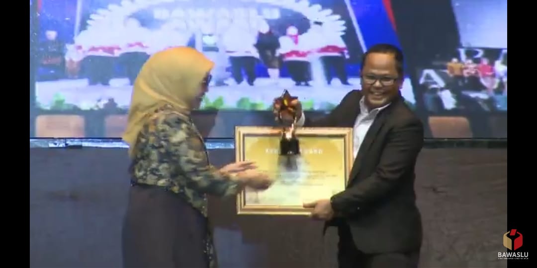 Terlihat Ketua Bawaslu Provinsi Riau, Rusidi Rusdan menerima langsung penghargaan tersebut dengan wajah berseri-seri.