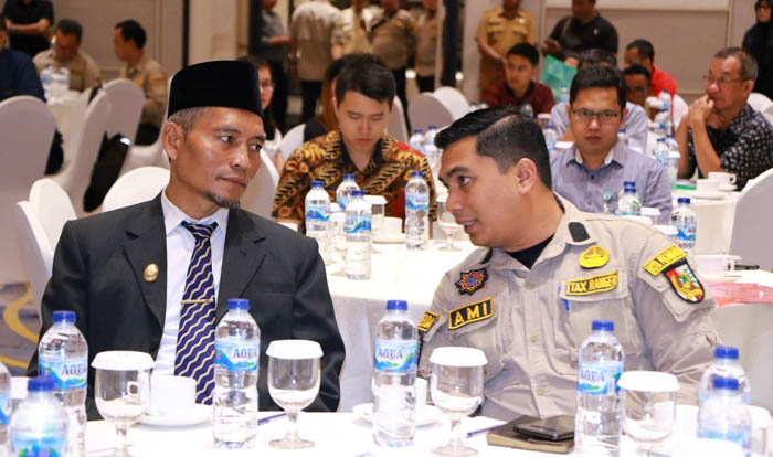 Kepala Bapenda H Zulhelmi Arifin, SSTP, MSi berbincang dengan Wawako Pekanbaru H Ayat Cahyadi, SSi pada acara sosialisasi pajak daerah.