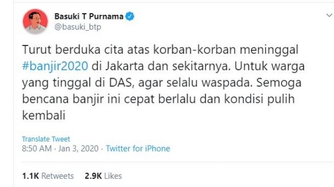 "Turut berduka cita atas korban-korban meninggal #banjir2020 di Jakarta dan sekitarnya. Untuk warga yang tinggal di DAS, agar selalu waspada. Semoga bencana banjir ini cepat berlalu dan kondisi pulih kembali," tulis @basuki_btp.