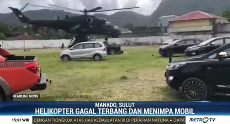 - Pada pukul 11.50 Wita Helikopter lepas landas tujuan Siau Kab. Sitaro. Namun Helikopter tidak ada power untuk naik dan hanya terbang rendah tiba-tiba menukik mundur sehingga bagian ujung dari sayap kiri Helikopter mengait bagian depan mobil dinas Palaksa Lanal Tahuna Letkol Laut (P) Christian jenis Suzuki Ertiga warna biru Noreg 6304-VIII yang diparkir di pinggir kanan Lapangan Gesit.