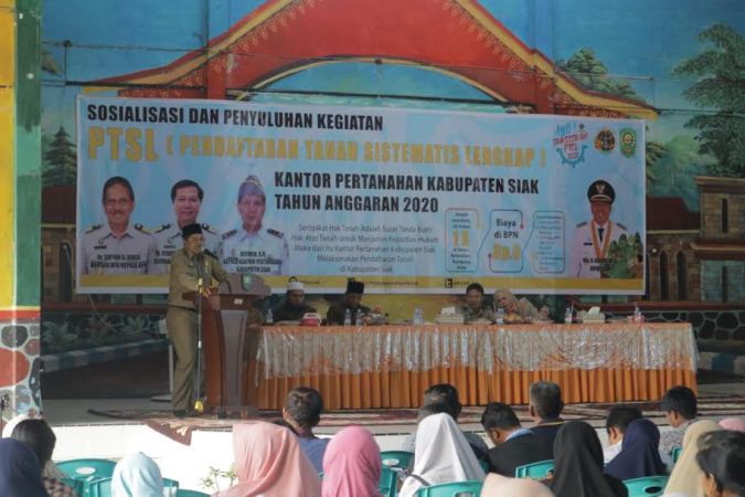 RIAUMANDIRI.ID, SIAK - Bupati Siak Alfedri bersama Plh kepala BPN Slamet Sutrisno lakukan Sosialisasi kegiatan pendaftaran tanah sistematis lengkap (PTSL) di Kecamatan Koto Gasib Kabupaten Siak, Senin (20/1/2020).