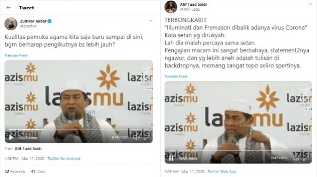 Warganet komentari pernyataan Ustadz Zulkifli yang sebut Illuminati dalang Virus Corona (twitter/@zoelfick dan @AfifFuadS)