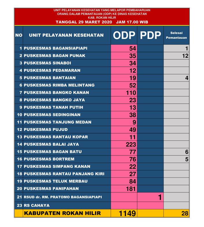 RIAUMANDIRI.ID, ROKAN HILIR - Hingga Ahad (29/3/2020) sore, junlah Orang Dalam Pengawasan (ODP) di Kabupaten Rokan Hilir (Rohil) mencapai 1.149 orang. Sedangkan Pasien Dalam Pengawasan (PDP) berjumlah satu orang yang kini dirawat di RSUD DR RM Pratomo.