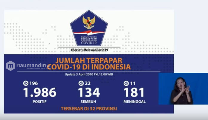RIAUMANDIRI.ID, JAKARTA – Juru Bicara Pemerintah terkait Penanganan virus Corona Covid-19, Achmad Yurianto kembali memperbarui informasi terkini wabah virus Corona di Tanah Air per hari ini, Jumat (3/4/2020).