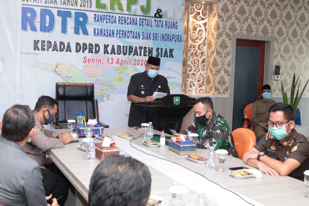 RIAUMANDIRI.ID, SIAK - Bupati Siak Alfedri menyampaikan Laporan Keterangan Pertanggungjawaban (LKPJ) Bupati Siak Tahun 2019 dan Ranperda Rencana Detail Tata Ruang (RDTR) Kawasan Perkotaan Siak Sri Indrapura Tahun 2020-2040 bersempena Rapat Paripurna DPRD Siak di Ruang Bandar Siak Live Room Command Center Kantor Bupati Siak, Senin (13/4/2020).