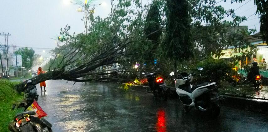 Kedua warga yang sedang berboncengan menggunakan sepeda motor tertimpa pohon tumbang saat melintas di Jalan Baharuddin Yusuf, depan Kantor Bupati Inhil.