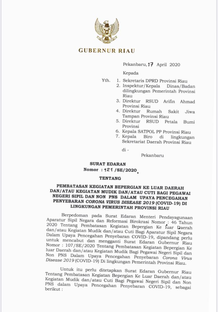 RIAUMANDIRI.ID, PEKANBARU - Gubernur Riau mengeluarkan surat edaran (SE) pembatasan kegiatan mudik bagi Aparatur Sipil Negara (ASN) dan non ASN. SE ini dikeluarkan setelah adanya imbauan yang sama dari Presiden Joko Widodo.