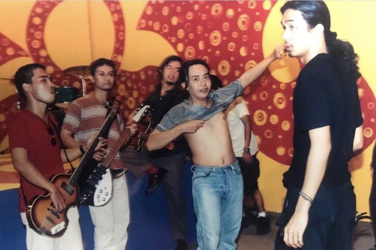 Dalam foto itu, terlihat para pesonel Dewa 19 masih sangat muda. Erwin terlihat mengangkat baju dan melihat ke arah kamera.