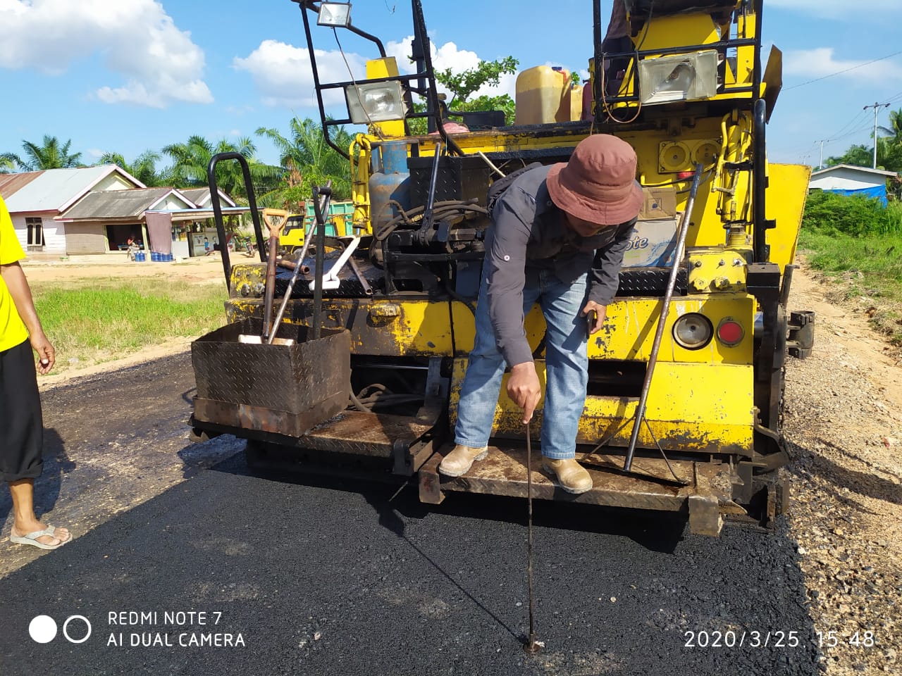Bupati H Suyatno meninjau pembangunan jalan di Kecamatan Pekaitan. Bupati menyapa operator alat berat yang sedang bekerja.