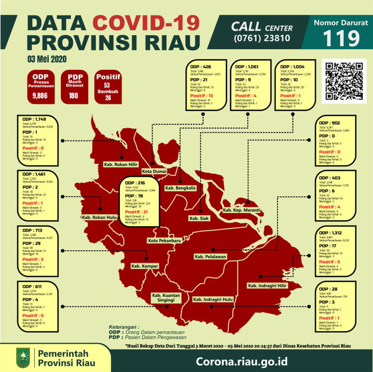 Namun terhitung Ahad (3/5/2020), peta infografik tersebut yang menampilkan hasil rekap data dari tanggal 3 Maret s/d 3 Mei 2020 (tepat 2 bulan), pukul 20:24:37 WIB, 12 kabupaten/kota di Riau sudah berubah menjadi sewarna, yakni merah.