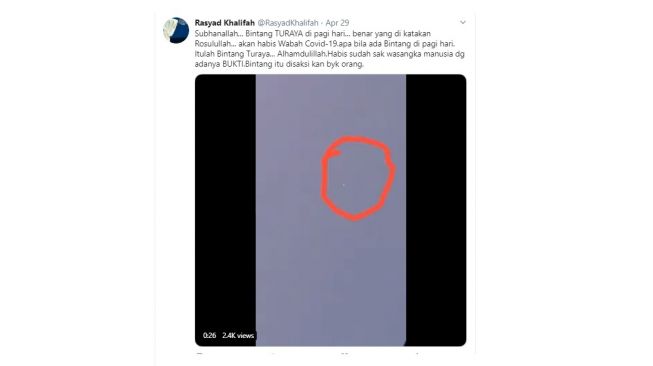 Subhanallah... Bintang TURAYA di pagi hari... benar yang di katakan Rosulullah... akan habis Wabah Covid-19.apa bila ada Bintang di pagi hari. Itulah Bintang Turaya... Alhamdulillah.Habis sudah sak wasangka manusia dg adanya BUKTI.Bintang itu disaksi kan byk orang. pic.twitter.com/AAnM2p3KNu