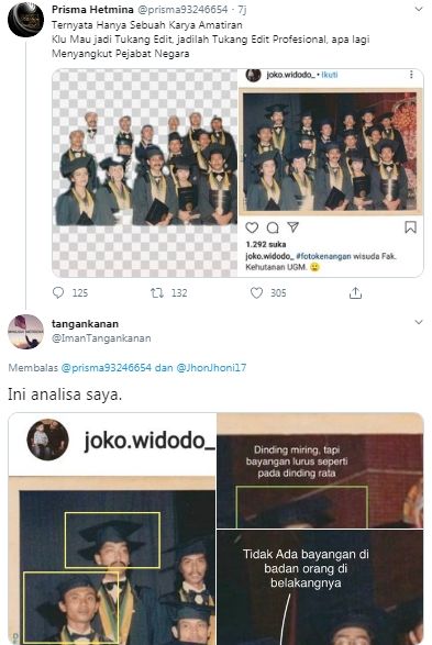 Cuitan tersebut direspons oleh warganet lainnya @imantangankanan yang membuat analisis kecil-kecilan dari foto wisuda Jokowi. Ia mempertanyakan bayangan dalam foto tersebut yang tampak tidak sama.