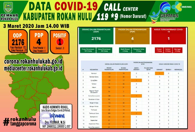 Yusmar juga menyampaikan, data perkembangan penyebaran COVID-19 di Kabupaten Rohul per Jumat (3/4/2020) hingga pukul 17.55 WIB kemarin. Data ini berdasarkan rekap Surveilens penanganan COVID-19 Corona RSUD Rohul, Dinas Kesehatan Rohul dari laporan Kepala Puskesmas se Rohul, data seluruh Dokter, Bidan dan petugas Kesehatan di Kecamatan dan desa. Dimana untuk pasien Orang Dalam Pemantauan (ODP) di Rohul kata Yusmar, yakni warga yang kembali dari luar Rohul, atau warga lain yang datang ke Rohul dari daerah yang sudah terinveksi COVID-19 total 2.321 orang, dengan status masih pemantauan 1963 orang dan ada 358 orang Selesai Pemantauan (eks ODP).