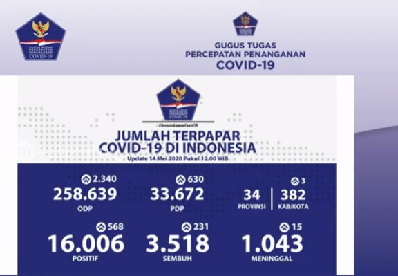 Per hari ini, Kamis (14/5/2020) hingga pukul 12.00 WIB siang tadi, pihaknya menerima data tambahan pasien positif Corona, yakni 568 kasus baru. Dengan demikian total positif Corona di Indonesia sudah 16.006 orang. Sementara total sembuh 3.518 pasien, dan total meninggal 1.043 orang.
