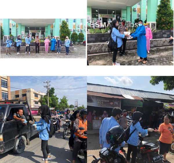 Setelah penyerahan 2 kotak masker dan 10 sarung tangan kepada Puskesmas setempat, para mahasiswa ini langsung turun ke lapangan untuk membagikan 1 kotak masker untuk masyarakat yang tidak menggunakan pelindung diri di jalanan.