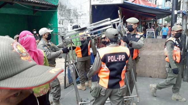 Berdasarkan pantauan di lokasi pada Jumat (22/5/2020) sekitar pukul 11.30 WIB, petugas Satpol PP dibantu dengan Polri-TNI melakukan penertiban kepada sejumlah pedagang yang masih nekat membuka lapak di Pasar Tanah Abang.