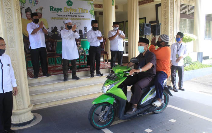 RIAUMANDIRI.ID, PEKANBARU - Wabah Corona ternyata tidak menyurutkan semangat untuk merayakan Idul Fitri 1441 Hijriah. Dengan tetap menerapkan protokol kesehatan, seperti memakai masker dan physical distancing, civitas akademika Universitas Lancang Kuning (Unilak) menggelar "Raye Drive Thru" di kampus kebanggaan masyarakat Riau itu, Selasa (26/5/2020).