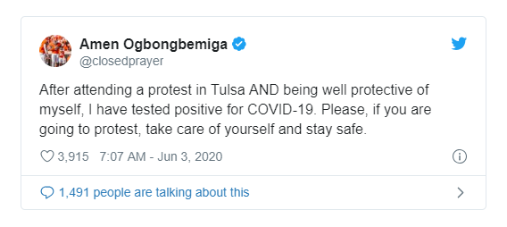 "Setelah mengikuti aksi protes di Tulsa dan menggunakan alat untuk melindungi diri sendiri, saya dinyatakan positif Covid-19," tulis Ogbongbemiga melalui Twitter dikutip pada Rabu (3/6/2020).