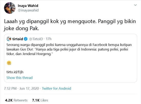 Melalui cuitan pada Rabu (17/6/2020), Inaya Wahid mengungkapkan bahwa seharusnya polisi bukan menangkap pengguna Facebook yang mengunggah humor Gus Dur "3 polisi jujur" itu, melainkan si pencetus humor, yaitu almarhum Gus Dur sendiri.