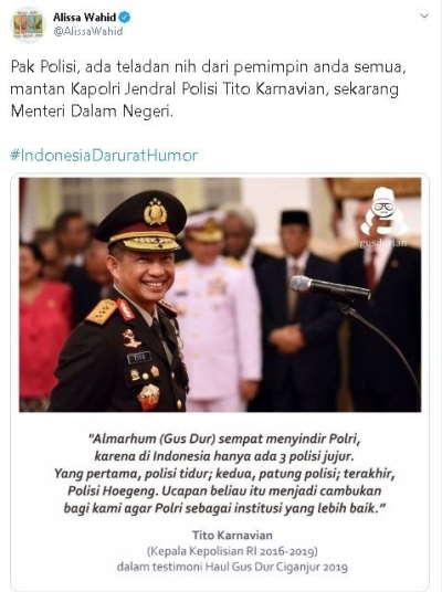 "Pak Polisi, ada teladan nih dari pemimpin anda semua, mantan Kapolri Jendral Polisi Tito Karnavian, sekarang Menteri Dalam Negeri," sindir @AlissaWahid.