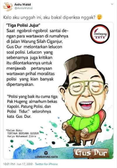 Terakhir, putri ketiga Gus Dur, yaitu Anita Hayatunnufus atau Anita Wahid, juga memberikan sentilan yang tak kalah jenaka. Lewat akun @AnitaWahid, ia menuliskan, "Kalo aku unggah ini, aku bakal diperiksa nggak?"