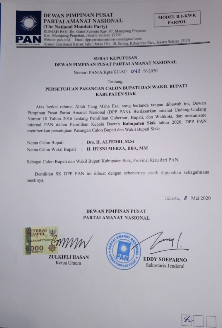 Penetapan tersebut tertuang pada Surat Keputusan (SK) tentang Persetujuan Pasangan Calon Bupati dan Wakil Bupati Kabupaten Siak Nomor: PAN/A/Kpts/KU-SJ/042/V/2020 tanggal 8 Mei 2020, dilakukan langsung oleh Ketua Umum PAN Zulkifli Hasan di Jl. Widya Chandra IV No. 16 Jakarta Selatan Kamis (18/6/2020) sekitar pukul 21.30 WIB.