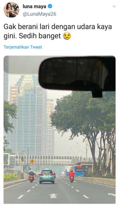 "Nggak berani lari dengan udara kayak gini. Sedih banget," tulis Luna Maya dengan menunjukkan foto jalanan Jakarta.