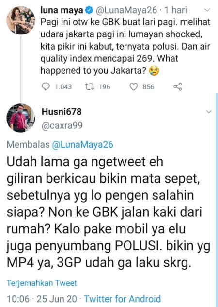 Alih-alih mendapat dukungan dari warganet atas unggahannya, Luna Maya justru dihujat. Mereka menyebutkan keluhan Luna Maya akan polusi udara Jakarta yang buruk tidak tepat.