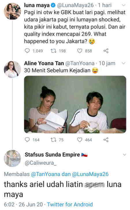 Dalam cuitannya, Luna terlihat memotret jalanan Jakarta dari dalam mobil. Ia pun mengatakan tidak berani lari, karena kondisi udara penuh polusi.