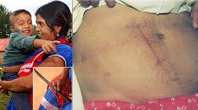 Dengan intuisi seorang ibu, dia mengambil alkohol untuk menghilangkan rasa sakit dan pisau. Setelah itu, dia mulai melakukan operasi caesar pada dirinya sendiri menggunakan pisau. Dia membuat tiga sayatan di perutnya, sayatan vertikal di samping pusarnya sambil berjongkok.