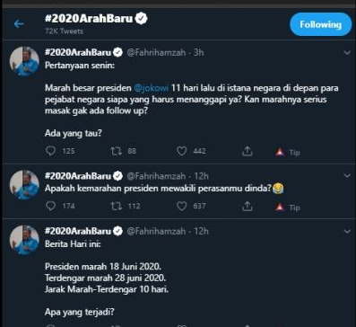 "Berita hari ini: Presiden marah 18 Juni 2020. Terdengar marah 28 Juni 2020. Jarak Marah-Terdengar 10 hari. Apa yang terjadi?" sindir Fahri Hamzah lewat Twitter-nya, Senin (29/6/2020).