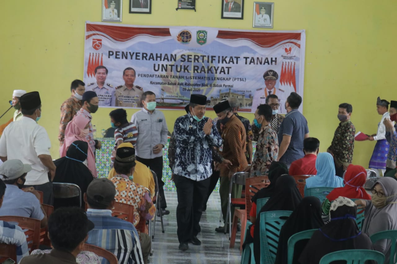 Penyerahan sertifikat secara langsung oleh Bupati Siak Alfedri didampingi Kepala Kantor Pertanahan Kabupaten Siak Hermen beserta UPIKA Kecamatan Sabak Auh. Bertempat di Aula Kantor Kampung Sabak Permai Kecamatan Sabak Auh, Kamis (9/7/2020)