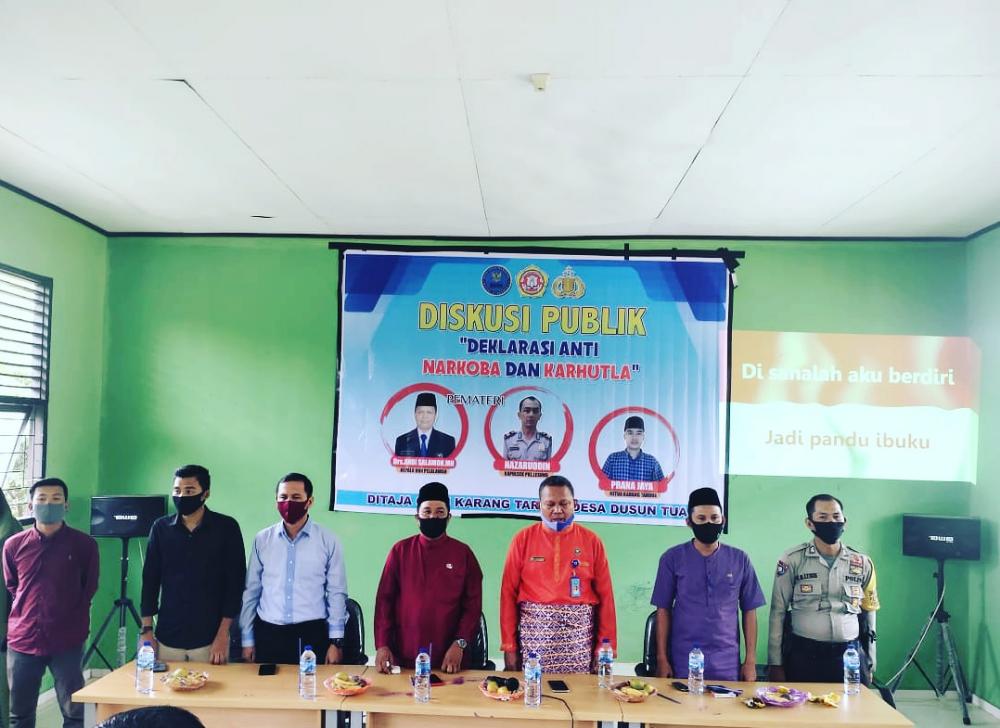 RIAUMANDIRI.ID, PELALAWAN - Karang Taruna Desa Dusun Tua bekerja sama dengan Polsek Pangkalan Lesung dan BNN Kabupaten Pelalawan menggelar kegiatan sosialisasi anti-narkoba dan karhutla, Selasa (4/8/2020).