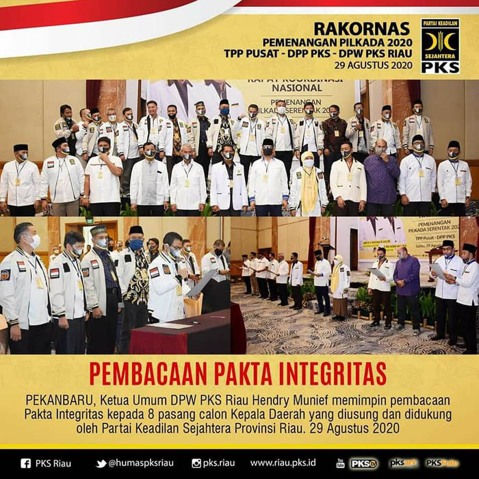 RIAUMANDIRI.ID, PEKANBARU – PKS Riau dan seluruh pasangan calon kepala daerah yang diusung PKS mengikuti agenda Rapat Koordinasi Nasional yang diadakan oleh DPP PKS dengan tajuk Pemenangan Pilkada Serentak 2020.