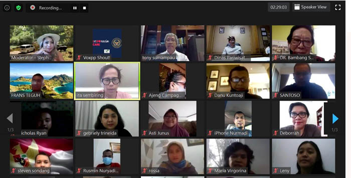 Webinar Voxpp Shout! Seri ketiga bertajuk “Lebih Jauh Kampanye Indonesia Care & Protokol K4 Di Daya Tarik Wisata” yang digelar oleh oleh Direktorat Komunikasi Pemasaran, Kementerian Pariwisata RI bersama Vox Populi Publicists melalui platform Zoom Meeting dan ditayangkan langsung pada Jumat sore, 4 September 2020 menghadirkan pembicara Staf Ahli Menteri Bidang Pembangunan Berkelanjutan dan Konservasi Kemenparekraf, Frans Teguh, Kepala Dinas Pariwisata Kabupaten Badung, Bali, Cokorda Raka Darmawan, Ketua Umum Perhimpunan Usaha Taman Rekreasi Indonesia (PUTRI), Bambang Soetanto dan Komisaris Taman Safari Indonesia, Tony Sumampau serta dipandu oleh Stephanie Amando sebagai moderator. (*)