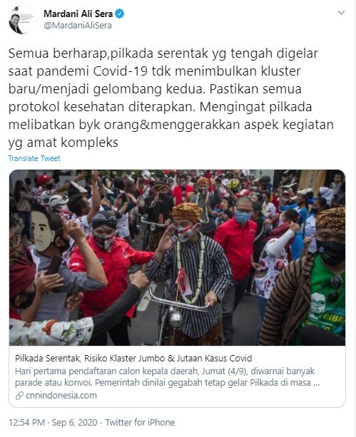 "Semua berharap, pilkada serentak yang tengah digelar saat pandemi Covid-19 tidak menimbulkan klaster baru atau menjadi gelombang kedua," ujar Mardani Ali Sera lewat akun Twitter pribadinya, Minggu (6/9/2020).