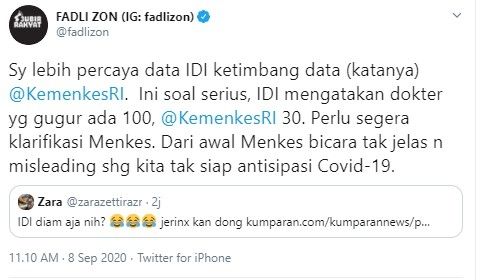 "Saya lebih percaya data IDI ketimbang data (katanya) @KemenkesRI," tegas Fadli.