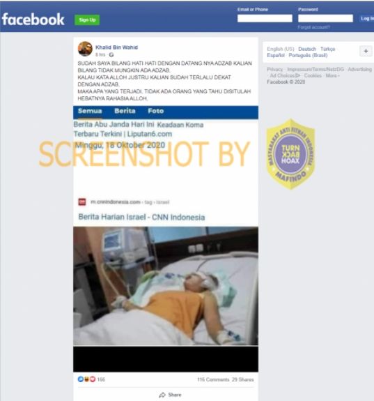 Klaim tersebut, salah satunya dibagikan oleh Khalid Bin Wahid dalam jejaring Facebook. Ia mengunggah foto tangkapan layar dengan keterangan "Berita Abu Janda Hari Ini Keadaan Koma".