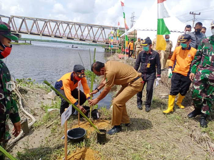 RIAUMANDIRI.ID, RIMBA MELINTANG - Bupati Rokan Hilir H Suyatno meresmikan penanaman vertiver untuk mencegah abrasi tidak meluas di sepanjang sungai Rokan di Kepenghuluan Jumrah, Kecamatan Rimba Melintang, Senin (7/12/2020).