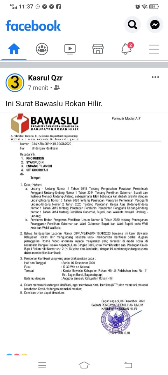 "Ini surat Bawaslu Rokan Hilir," tulisnya pada postingan surat keterangan undangan klarifikasi yang diperuntukkan kepada sejumlah nama dengan kop surat Bawaslu dan Formulir model A. 7.