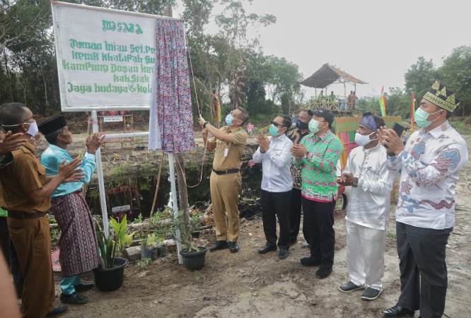 RIAUMANDIRI.CO, SIAK - Bupati Siak diwakili Asisten II Setda Kabupaten Siak Hendrisan didampingi Anggota DPRD Siak Zulfaini Adrian, serta Kepala Dusun Dosan Zamri meresmikan Taman Hijau Sei Penampo Kecik Khalifah Sulaiman yang berada di dusun tersebut, Selasa (29/12/2020).